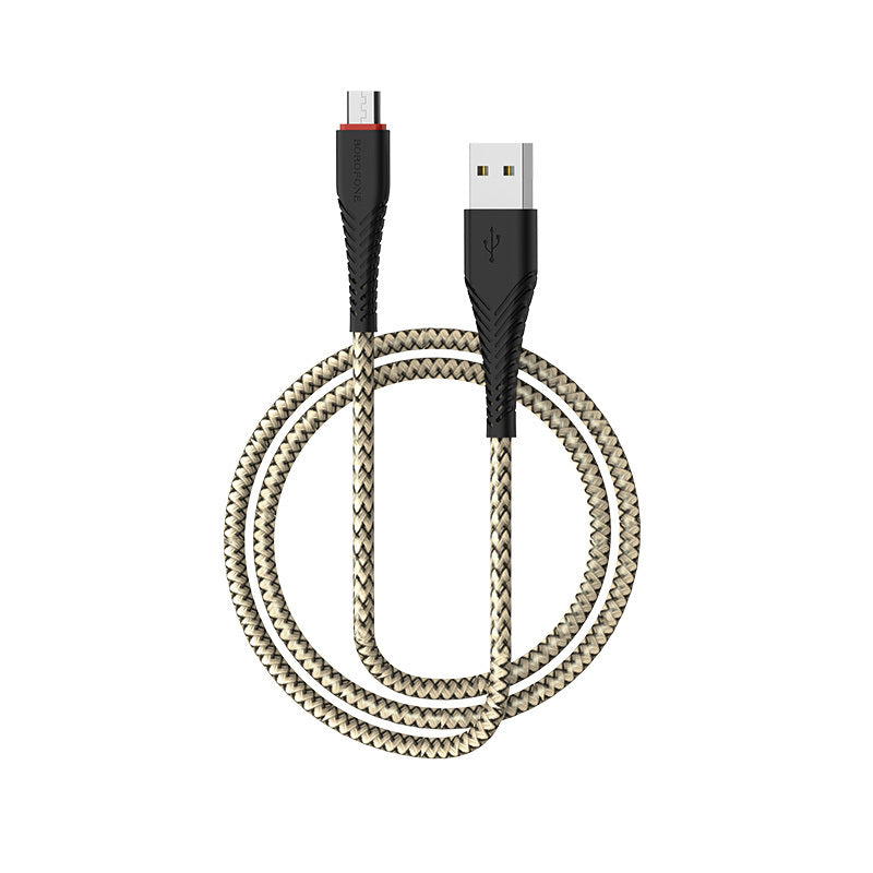 BOROFONE BX25 Powerful charging data cable for Micro-USB, 1m, nylon braid 1. Length: 1m, weight: 22g. 2. External braid: nylon. 3. Connector material: TPE. 4. Wire core: 24AWG (43/0.08) * 2C red / black + 28AWG (16 / 0.08) * 2C white / green, PE, OD: 2.3*6.0. 5. Support charging and data transmission.