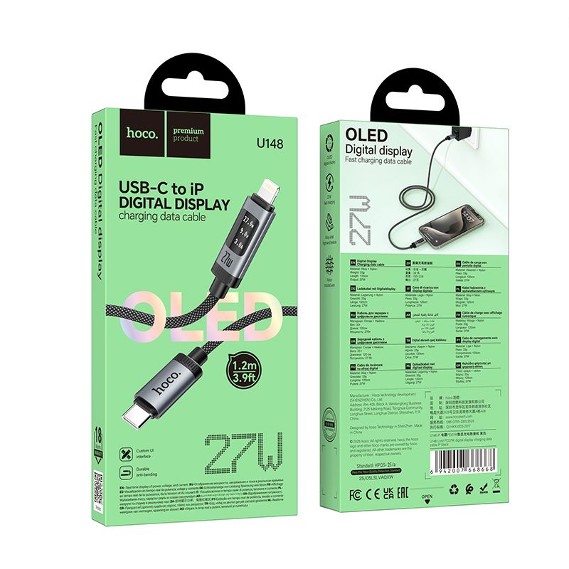 Data Cable with digital display USB C to Lightning Hoco PD 27W 1,2 m U148 black