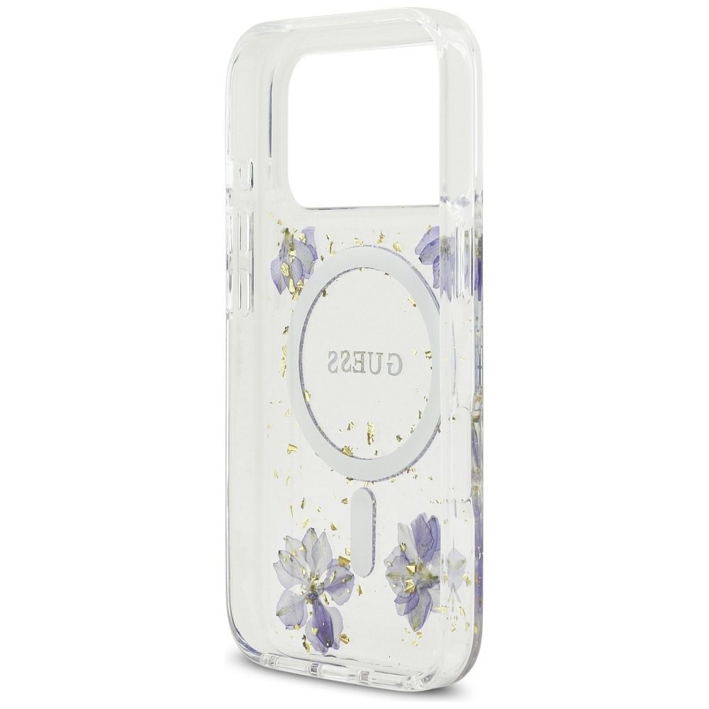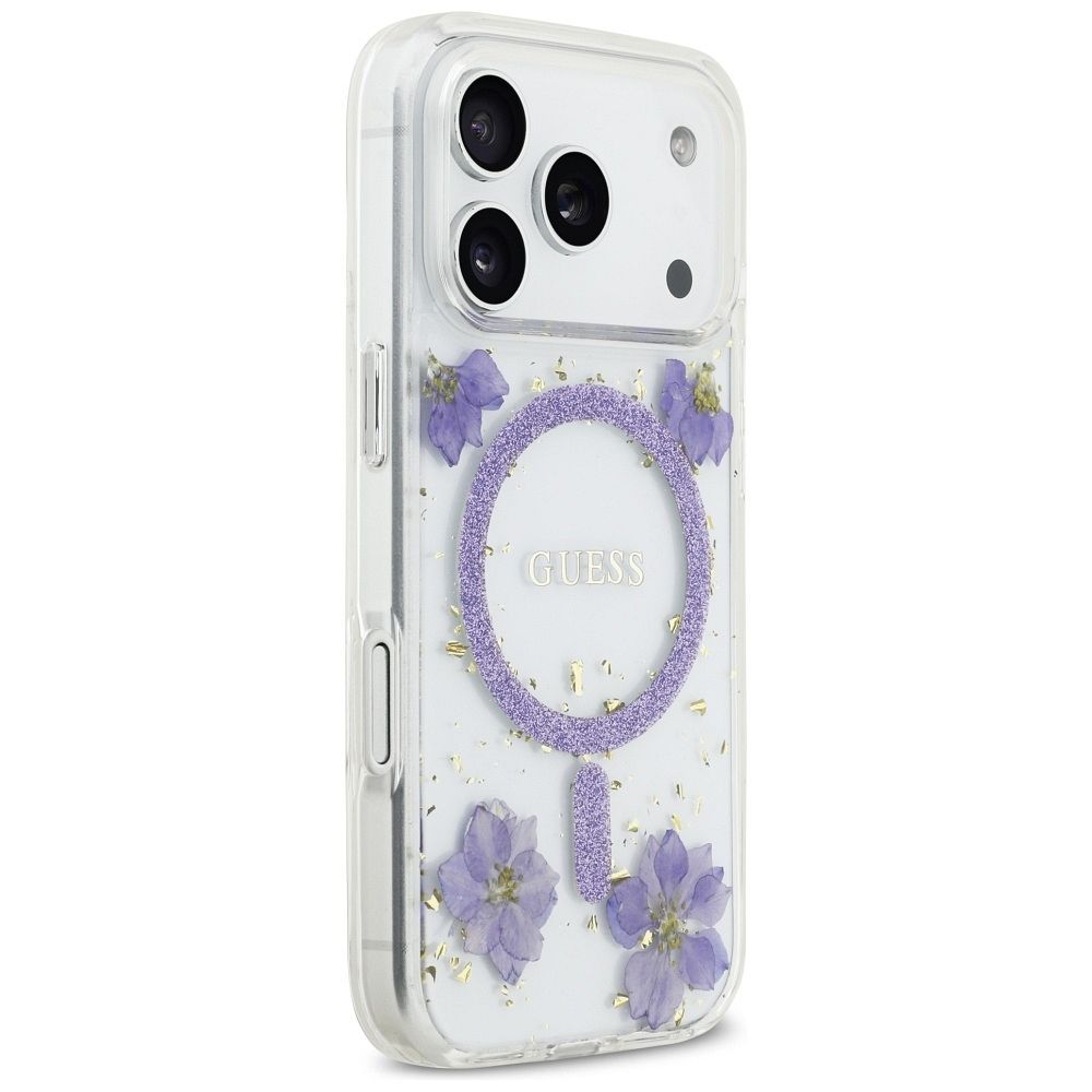 GUESS case for IPHONE 17 Pro compatible with MagSafe GUHMP17LRBFGFGMU (Resin Flowers and Glitter) purple