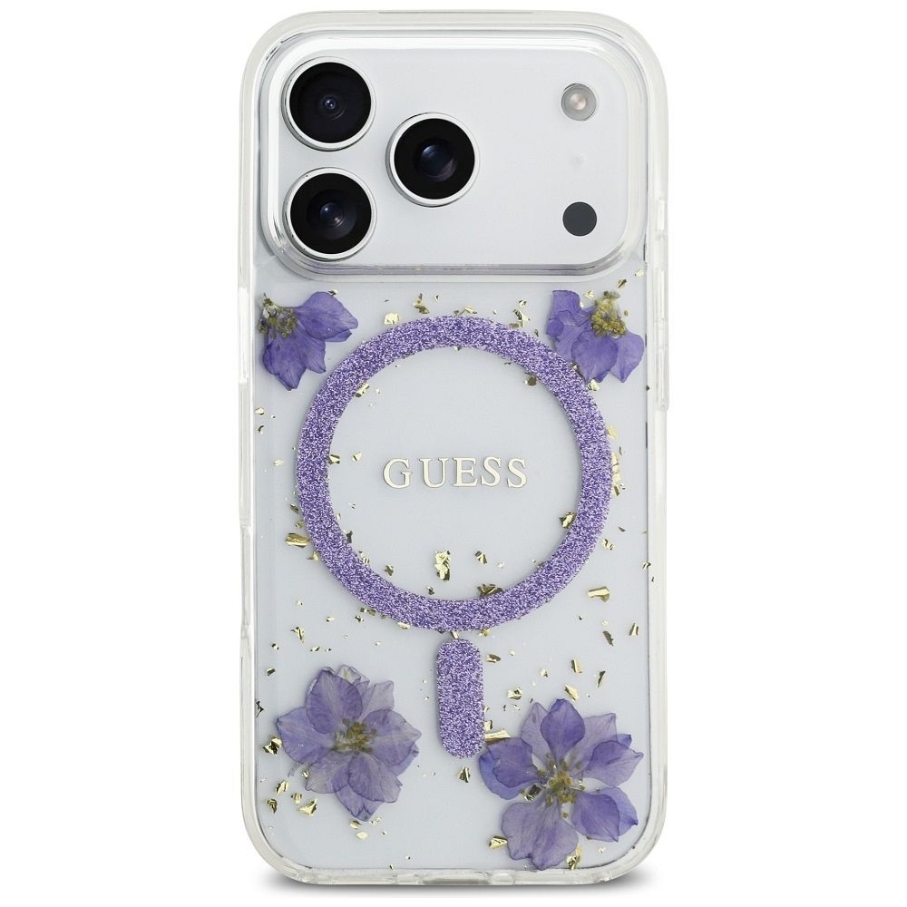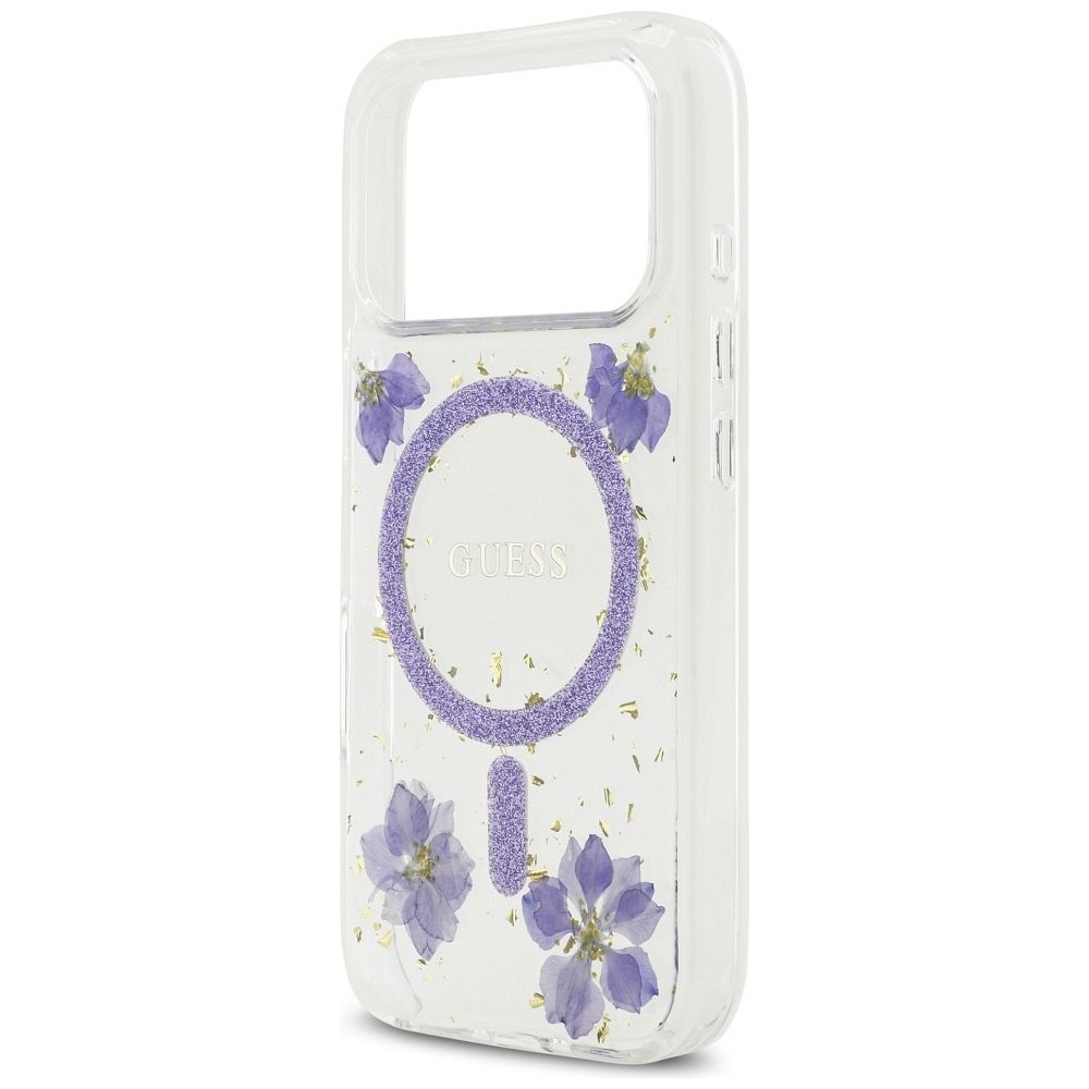 Оригинален гръб GUESS за IPHONE 17 Pro compatible with MagSafe GUHMP17LRBFGFGMU (Resin Flowers and Glitter) лилав