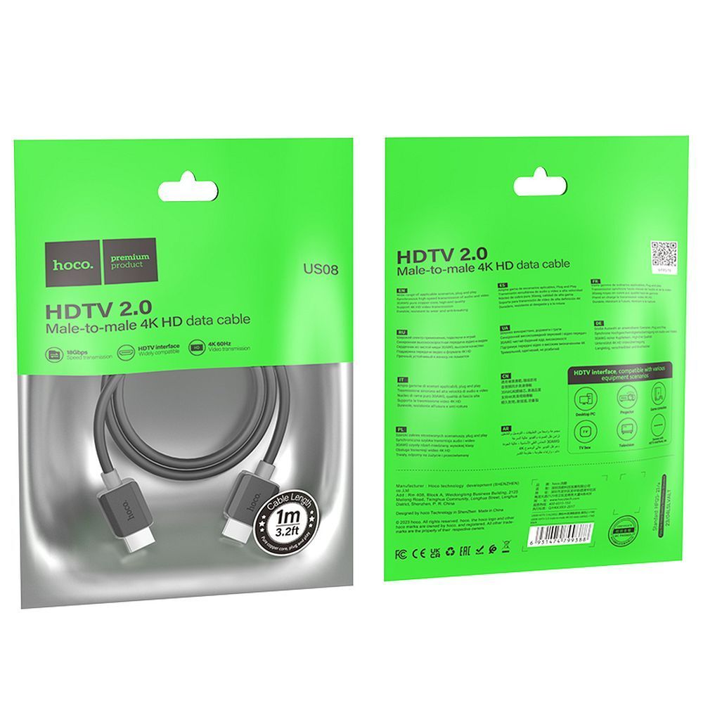 HOCO US08 is a high-quality HDMI - HDMI cable compliant with version 2.0, which enables the transmission of images in 4K resolution at 60Hz. Thanks to advanced technology and high bandwidth of 18 Gbps, it ensures smooth, uninterrupted signal transmission, making it an ideal choice for connecting TVs, monitors, game consoles, laptops and other devices.
