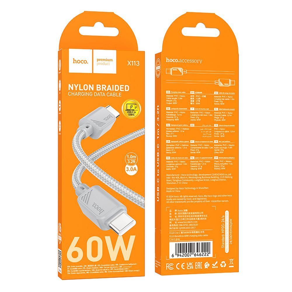 Hoco X113 fast charging cable with USB-C - USB-C connector, 1 meter long. Enables fast charging with up to 60 W and data transfer. Supports Power Delivery and Quick Charge 3.0 protocols.