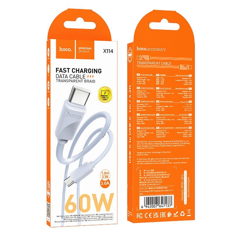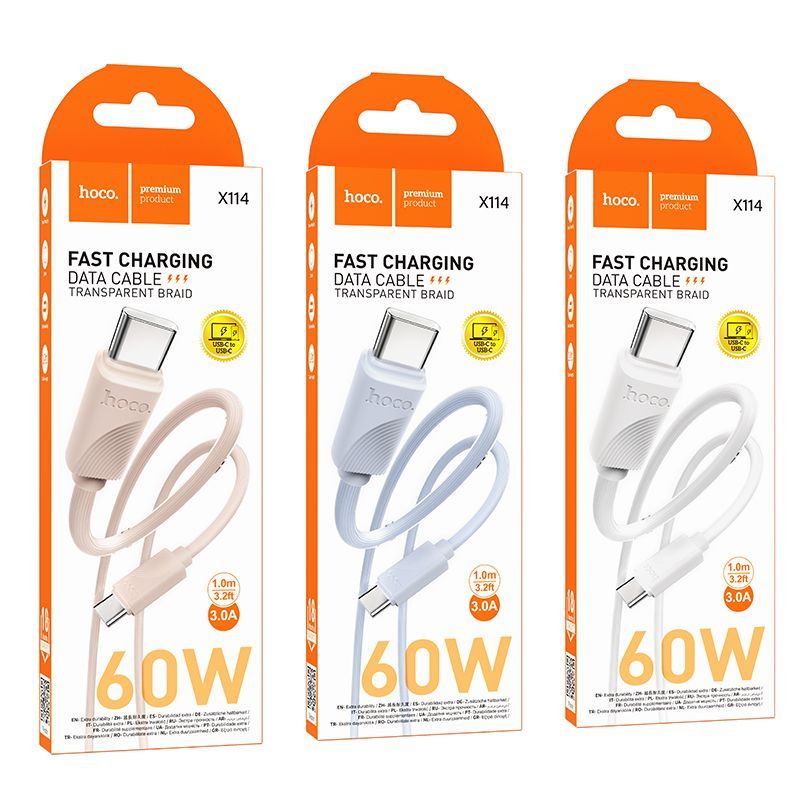 Hoco X114 fast charging cable with USB-C - USB-C connector, 1 meter long. Enables fast charging with up to 60 W and data transfer. Supports Power Delivery and Quick Charge 3.0 protocols.