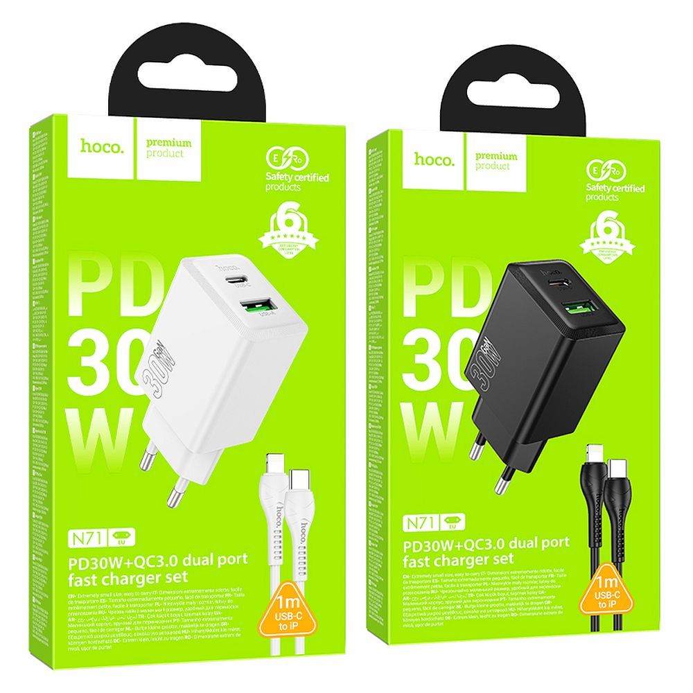 Hoco N71 network charger with fast charging function and dual output. Allows for rapid charging of mobile devices. Included with a 1-meter USB-C - USB-C cable.