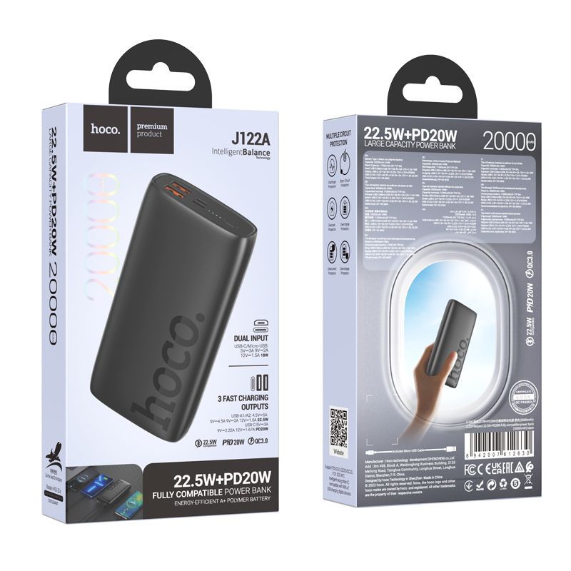 1, Capacity: 20000mAh 74Wh; Rated capacity: 11000mAh 2, input: Type-C/Micro: 18W 3, Output: USB-A1/A2: 22.5W (QC/FCP/SCP/AFC); Type-C:20W(PD/QC/FCP/AFC); Total output: 5V/3A 4, Display: LED light shows the power level 5, Material: ABS+PC flame retardant shell + lithium polymer battery 6, Size: 145*72*30mm; Weight: 403g