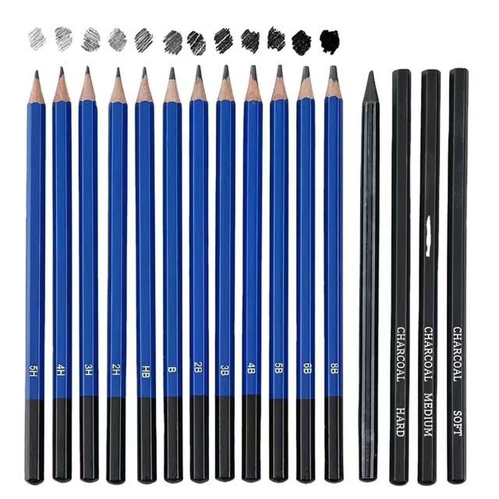 Пълен комплект: Комплектът включва разнообразие от графитни моливи, въглен, гумички, острилки и други аксесоари, които ви позволяват да създавате оригинални скици, рисунки и графики.