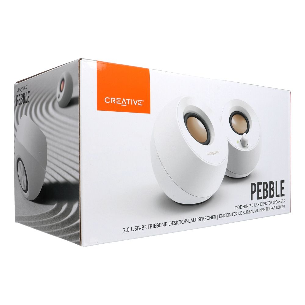 The Creative Pebble 2.0 are compact desktop stereo speakers featuring 45° elevated drivers, USB power supply, and a 3.5 mm audio input, delivering balanced sound for both work and entertainment.