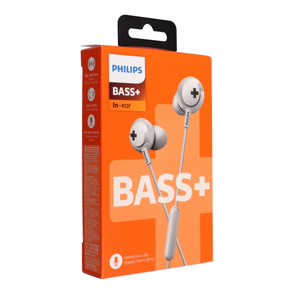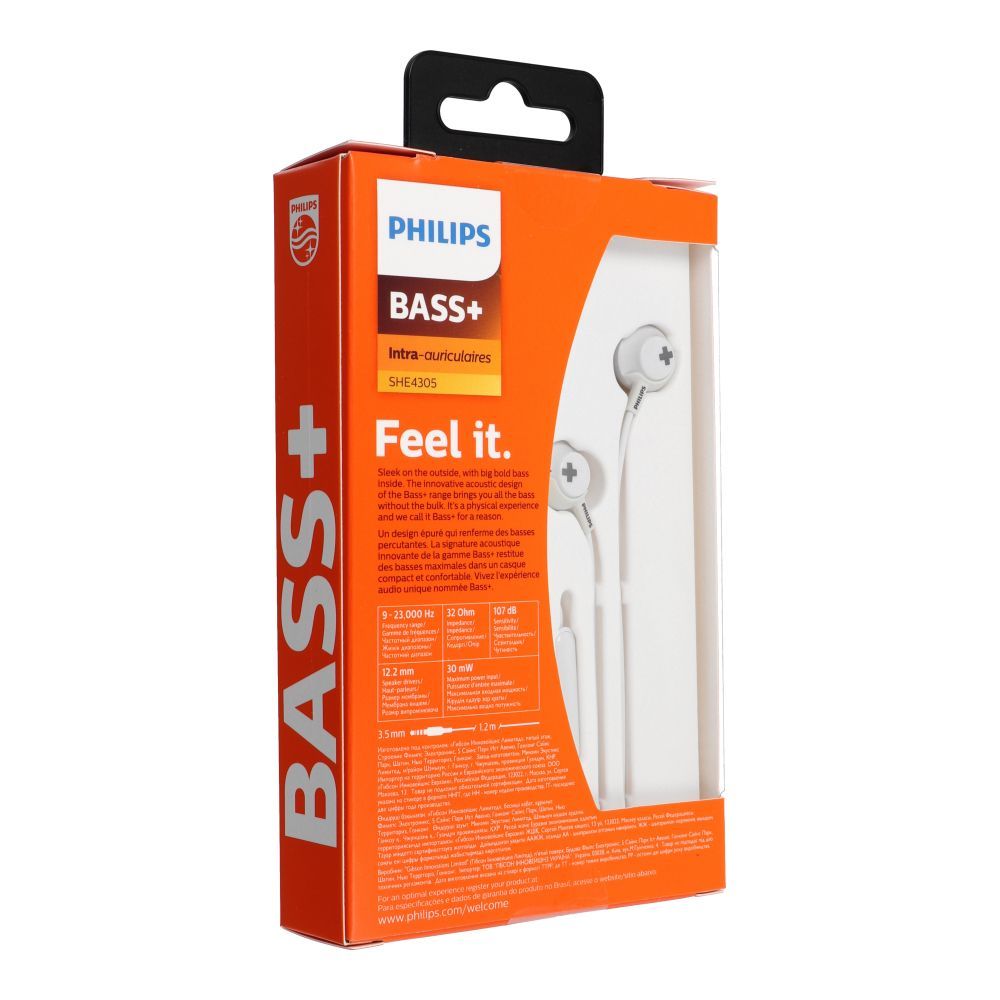 The Philips SHE4305WT in-ear headphones are lightweight and comfortable wired headphones designed for powerful, dynamic sound.Thanks to 12.2mm drivers and BASS+ technology, they deliver deep, punchy bass that lets you truly feel the beat of your favorite music.